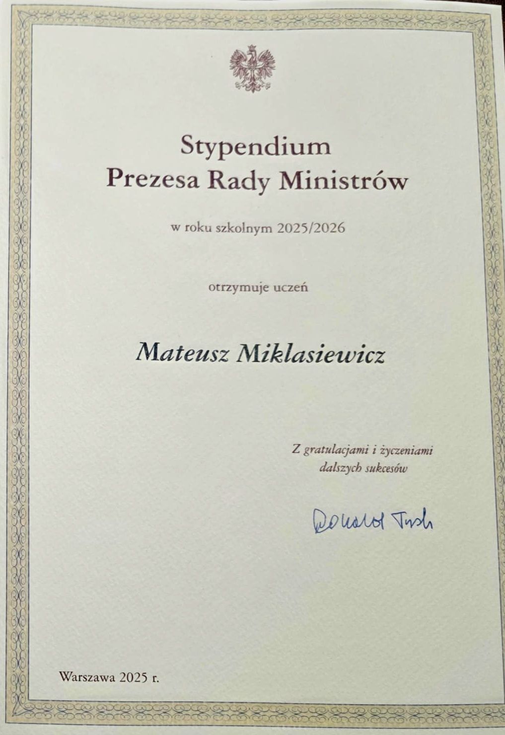 Serdeczne gratulacje dla Mateusza Miklasiewicza z klasy 4TIb, laureata Stypendium Prezesa Rady Ministrów!Życzymy, aby nadchodzący rok szkolny przyniósł Mu wiele sukcesów, umożliwił realizację ambitnych planów edukacyjnych oraz rozwijanie naukowych pasji i zainteresowań.