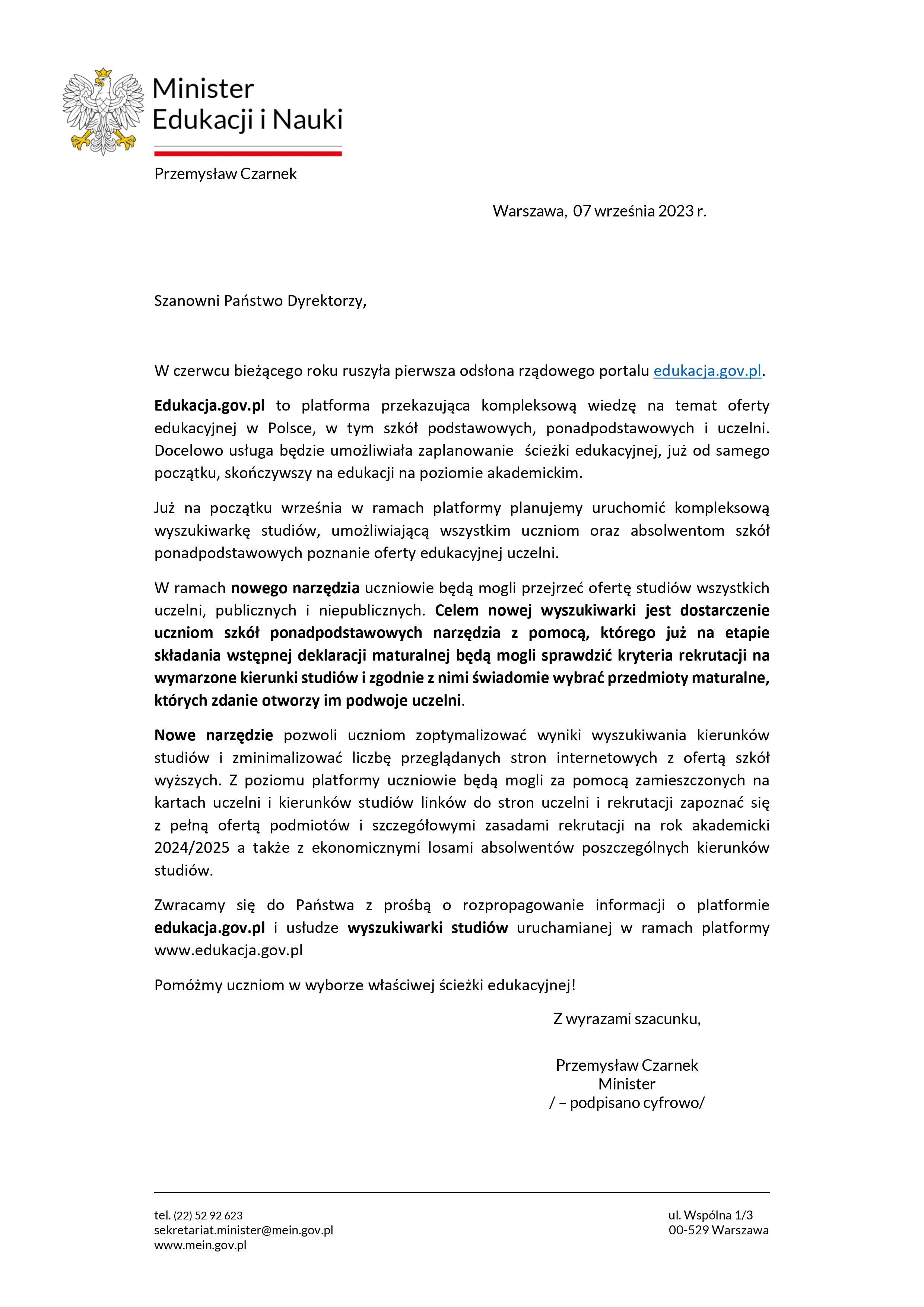 List Ministra Edukacji Narodowej w sprawie rządowego portalu – edukacja.gov.pl