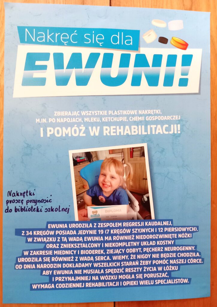 Każdy może włączyć się w akcję “Nakręć się dla Ewuni” polegającej na zbiórce wszelkich plastikowych nakrętek (po produktach spożywczych, napojach,chemii gospodarczej, kosmetykach…) na rzecz kilkuletniej chorej Ewy. Nakrętki w każdej ilości można dostarczać do biblioteki szkolnej. Akcja będzie trwała do 10.06.2024r.