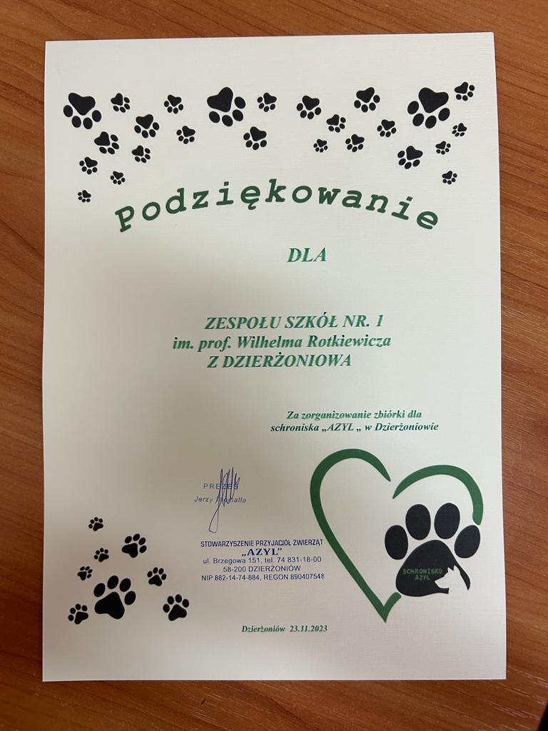 Zbiórka na schronisko Azyl troszkę się nam przedłużyła, ale warto było czekać, bo uzbieraliśmy bardzo ładną kwotę 835 zł, plus darowizny rzeczowe. Zakupiliśmy wskazaną przez opiekunów karmę oraz środki czystości i pojechaliśmy z grupą uczniów przekazać nasze dary. W nagrodę zabrał nas na spacer śliczny, puchaty podopieczny schroniska (szuka domu, gdyby ktoś miał ochotę się nim zaopiekować). Wszystkim darczyńcom jeszcze raz bardzo dziękujemy!